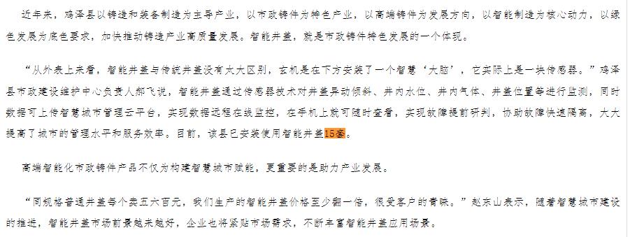 目前,多地已安裝使用智能井蓋,比如雞澤縣政府網(wǎng)2024年就有發(fā)布相關(guān)信息,該縣已安裝使用智能井蓋15套。
