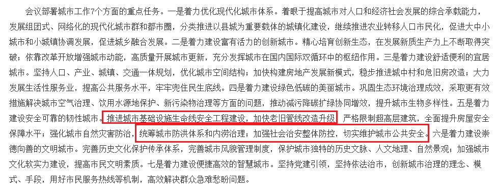其中任務(wù)五是:著力建設(shè)安全可靠的韌性城市。推進(jìn)城市基礎(chǔ)設(shè)施生命線安全工程建設(shè),加快老舊管線改造升級;嚴(yán)格限制超高層建筑,全面提升房屋安全保障水平;強(qiáng)化城市自然災(zāi)害防治,統(tǒng)籌城市防洪體系和內(nèi)澇治理;加強(qiáng)社會(huì)治安整體防控,切實(shí)維護(hù)城市公共安全。